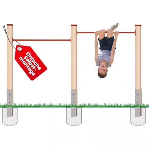Gartenreck für Kinder von Gartenpirat (eingetragene Marke): Modell DKR Bausatz Doppelreck zur Selbstmontage Aufbau über Eck oder in einer Linie Mit 3 Pfosten Vierkant 9×9 cm, Länge 180 cm Mit 3 H-Anker (mit Schrauben) für Fundament Mit 6 Schrauben M 10X110, Unterlegscheiben und Hutmuttern für H-Anker Mit 3 Abdeckkappen rot für Pfosten Mit 2 Reckstangen pulverbeschichtet, rot, Durchmesser ca. 33 mm, Länge 125 cm Mit 8 Sechskant-Holzschrauben für die Reckstangen Pfosten imprägniert, gehobelt, Kanten gerundet, Kopf rechtwinklig gekappt Wetterfest: für die dauerhafte Aufstellung im Freien Diese Turnstangen können Ihre Kinder das ganze Jahr nutzen